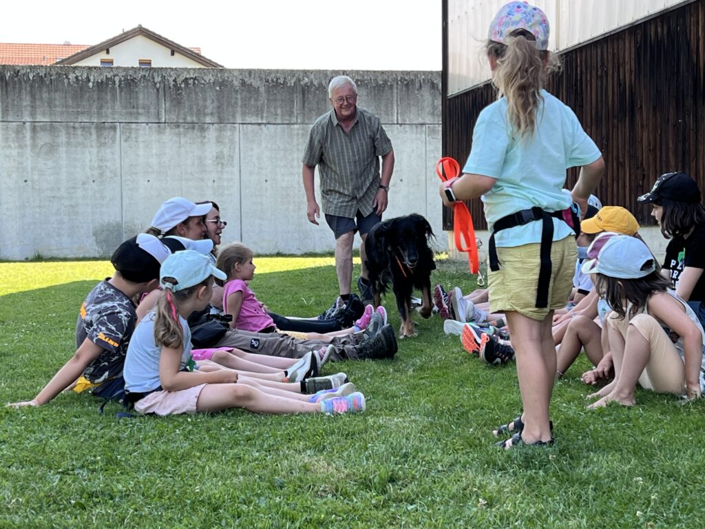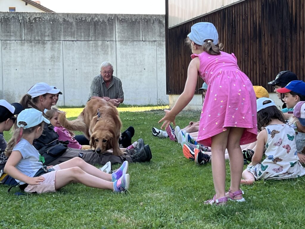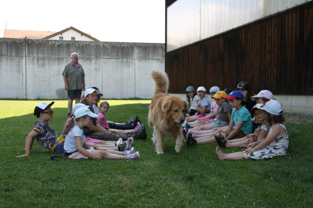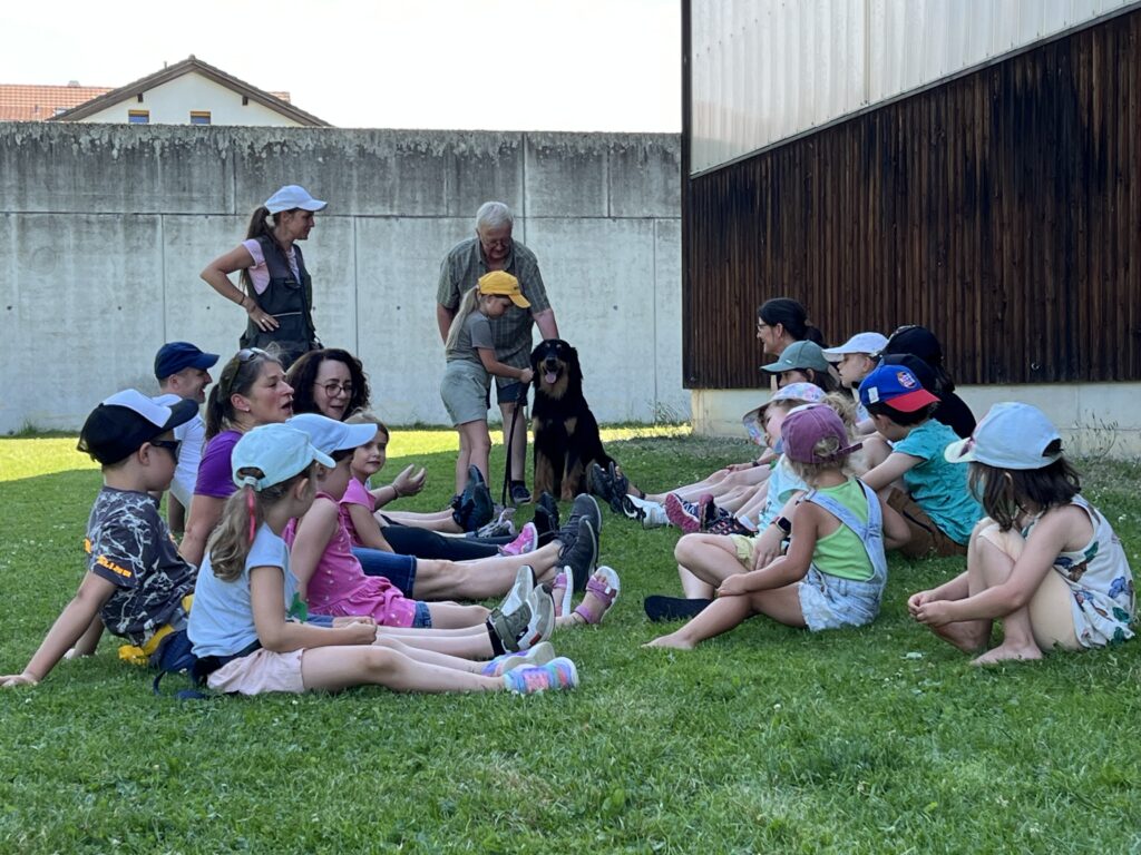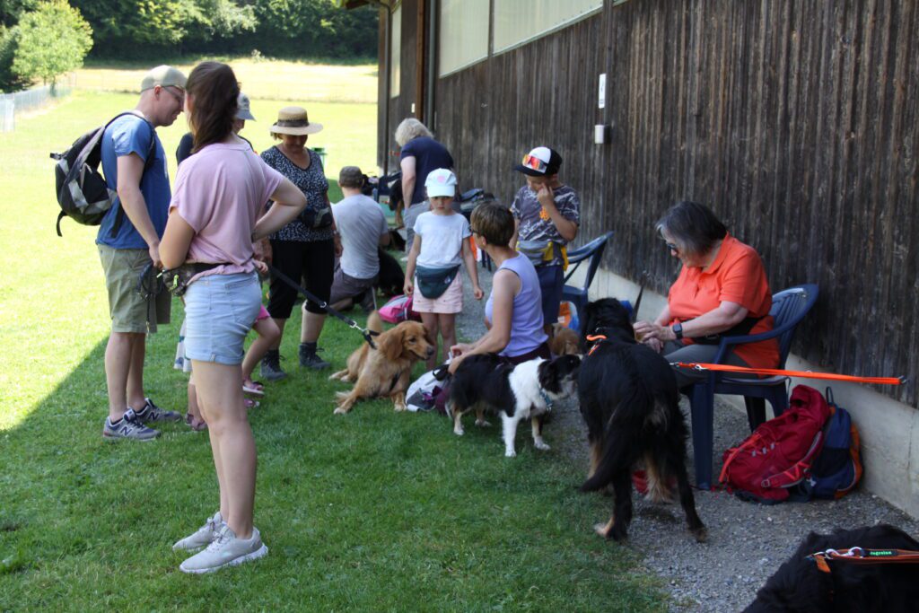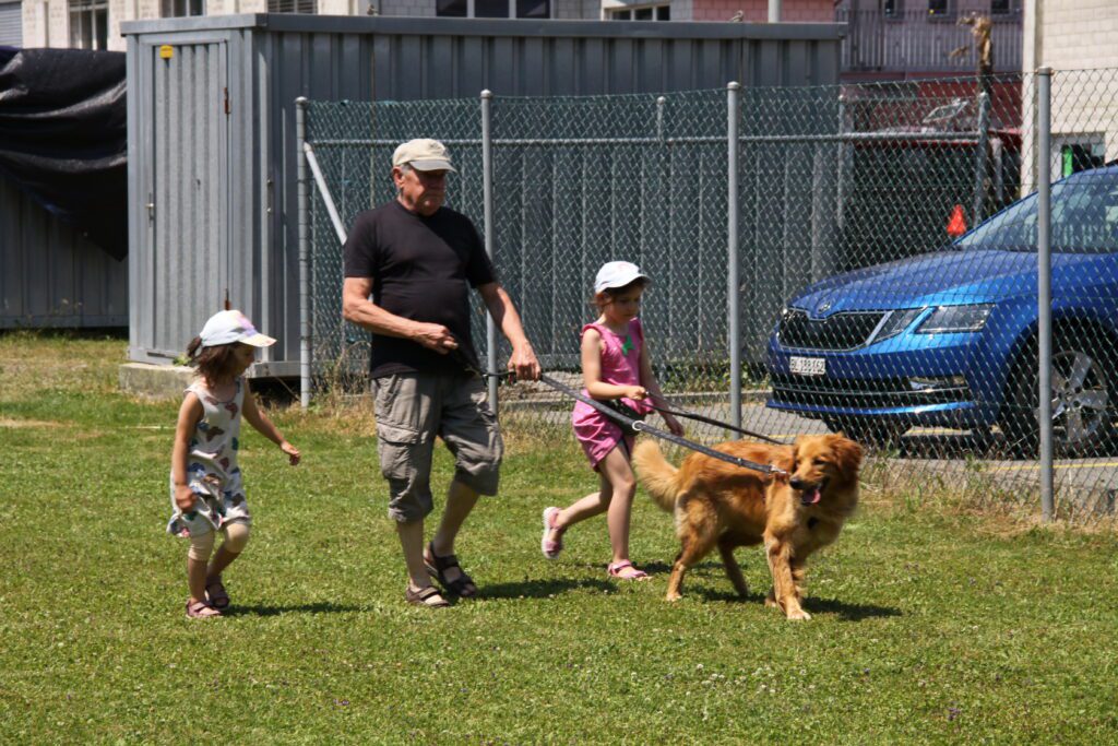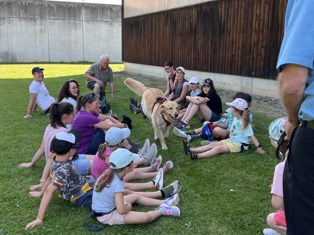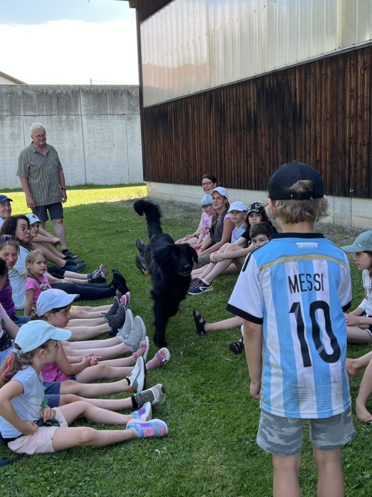 Nach dem Zvieri und vielen kühlen Getränken fand der Anlass mit einem Abrufen der Hunde zwischen den sitzenden Kindern hindurch seinen Abschluss. Zum Abschied und als Erinnerung an diesen tollen Nachmittag erhielten die Kinder eine selbstgenähte Stofftasche mit lustigen Hundemotiven. Die Belohnung für die Erwachsenen waren die leuchtenden Augen in den von Schweiss glänzenden Kindergesichtern.