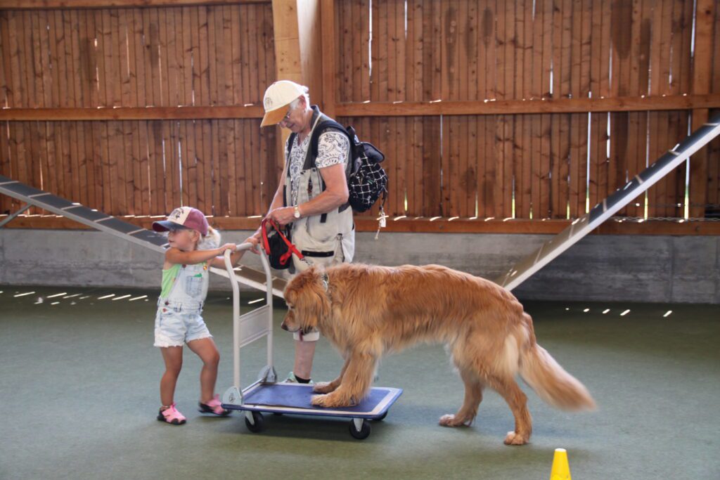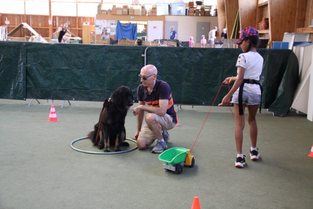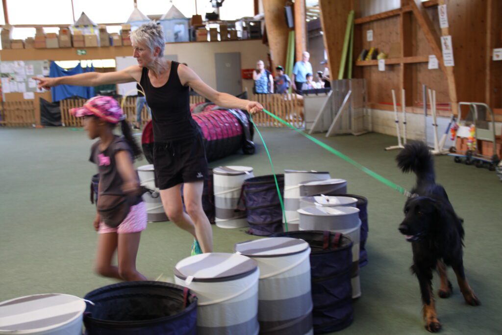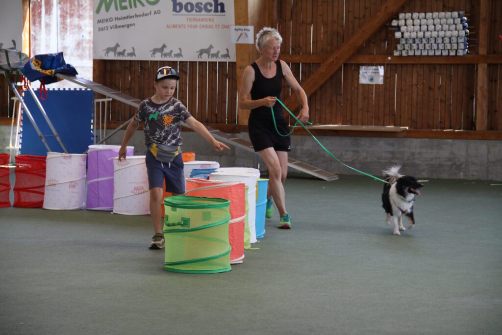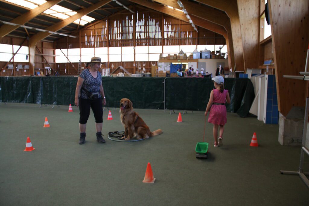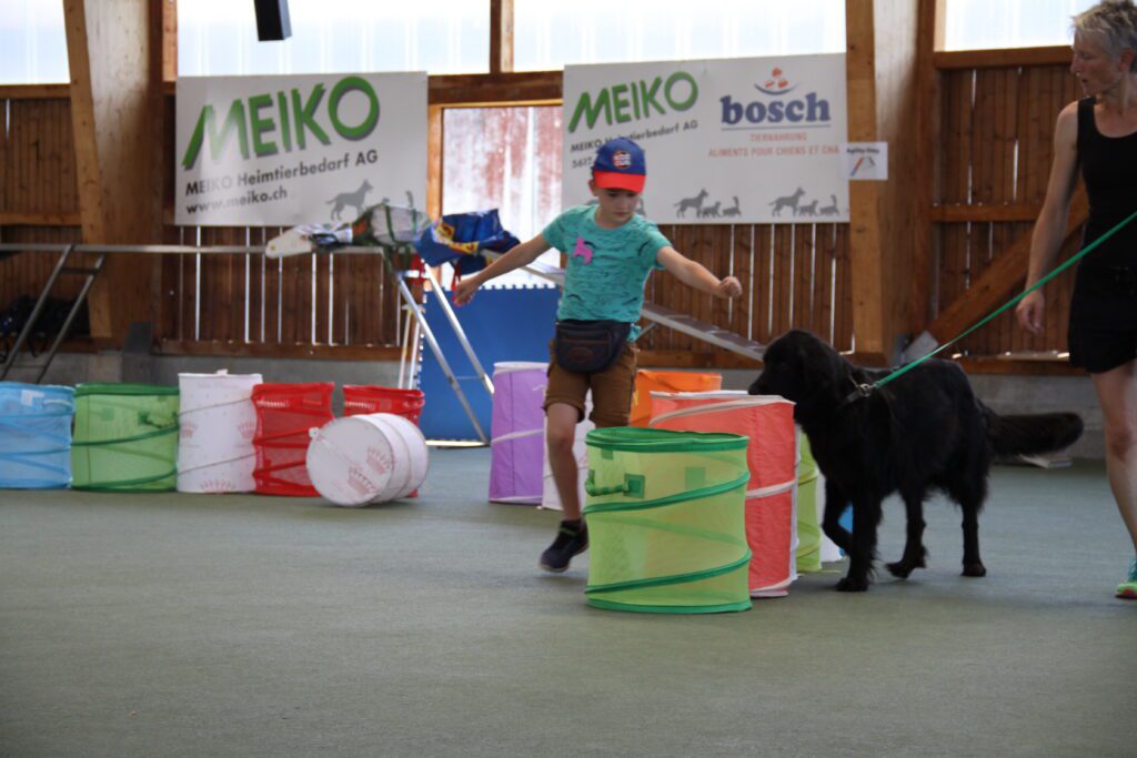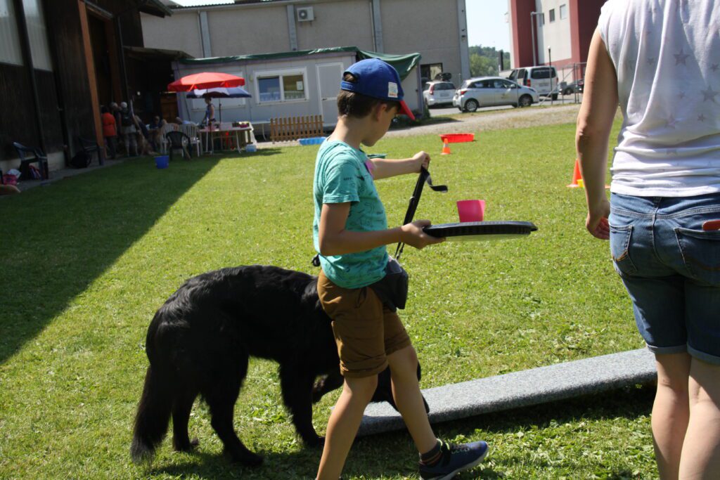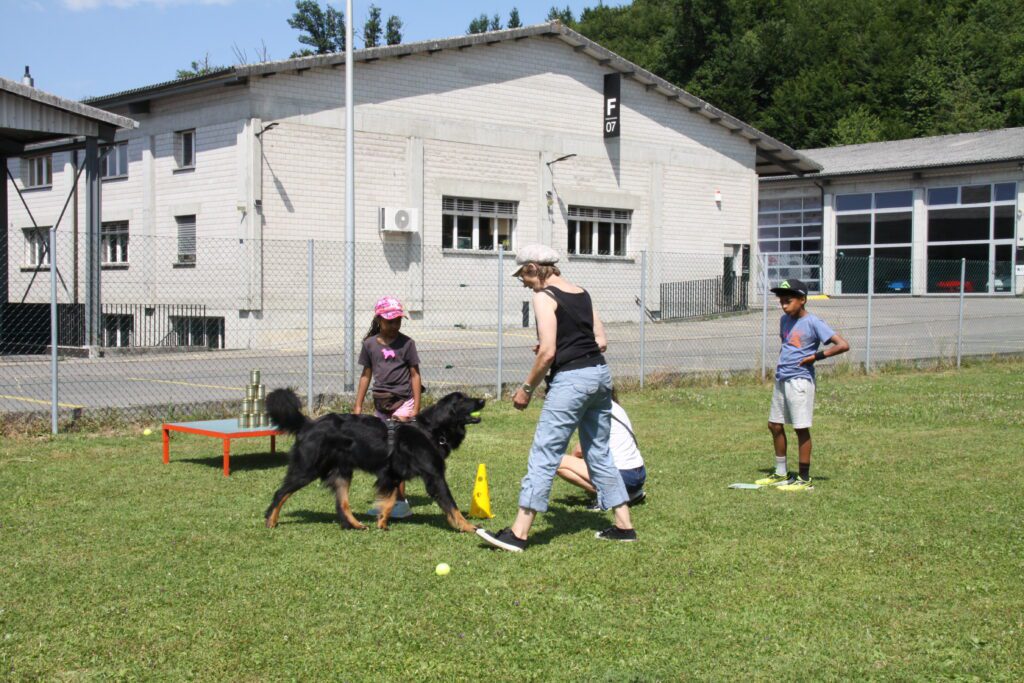 Zahlreiche Posten mit teils kniffligen Aufgaben forderten die Teams heraus: Geschicklichkeit, Phantasie und "Mut" waren gefragt, um die Aufgaben zu meistern. Beim Büchsen-Werfen und beim «Schwertransport», bei welchem der Hund in einem Hulahop-Ring sitzen bleiben musste, währenddem die Kinder mit einem mit Würstchen beladenen Spielzeuglastwagen manövrierten, ging es um die Impulskontrolle. Ihre vorzügliche Nase konnten die Hunde beim Suchen von Keksen, die in einer Muffinform unter Tennisbällen versteckt waren, unter Beweis stellen. Aber auch beim Suchen von in der Wiese verteilten Hölzli war Nasenarbeit gefragt, das Lösungswort aus Buchstabensalat A-O-H-W-R-A-V-T zu bilden, war dann aber Aufgabe der Kinder. Für etwas Abkühlung sorgte das Würstli-Fischen aus dem Wasser und das Abschiessen von Bechern mit einer Wasserpistole. Eine echte Herausforderung war der Schlittenhund-Posten, bei welchem für die Hunde auf einem Plattformwagen sitzend durch einen Slalom gefahren werden mussten. Da die Sitzfläche für die grossen Rüden eher knapp bemessen war, hatte der eine oder andere sichtlich Mühe sich hinzusetzen – die herunterhängenden Rute putzte dann auch gleich noch den Boden.