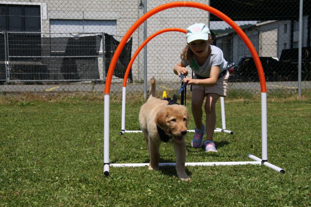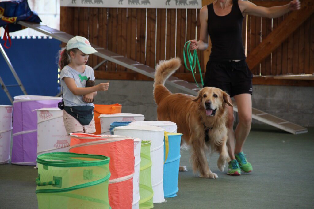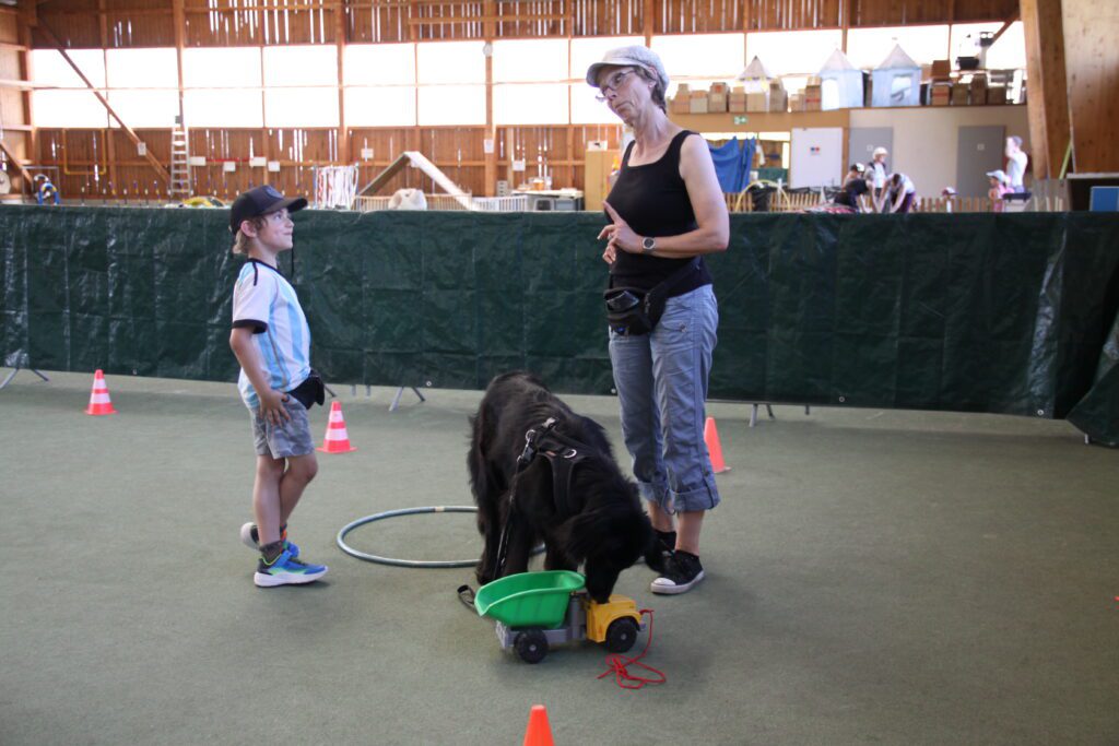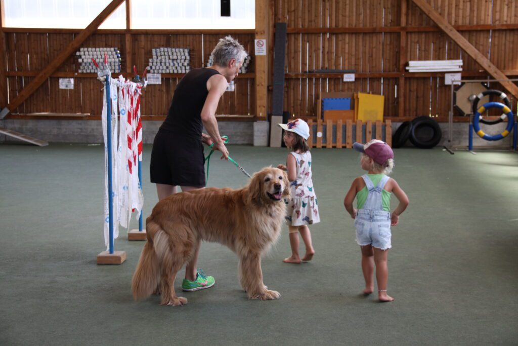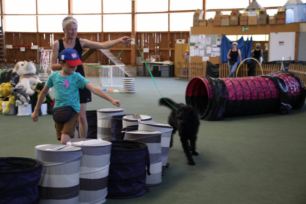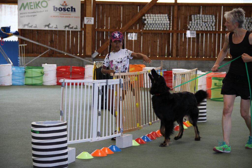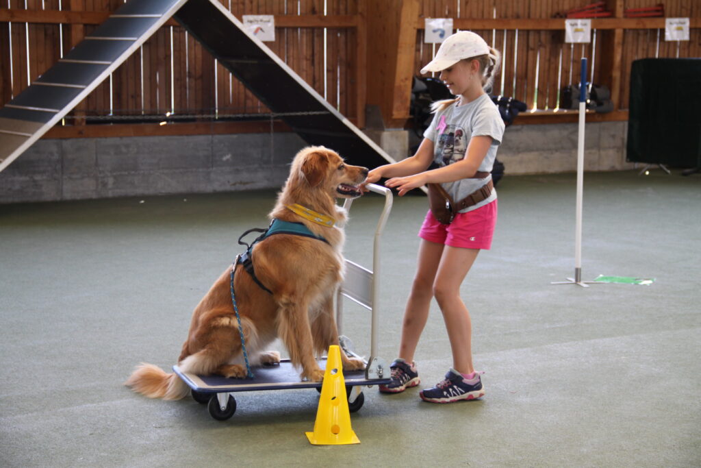 Zahlreiche Posten mit teils kniffligen Aufgaben forderten die Teams heraus: Geschicklichkeit, Phantasie und "Mut" waren gefragt, um die Aufgaben zu meistern. Beim Büchsen-Werfen und beim «Schwertransport», bei welchem der Hund in einem Hulahop-Ring sitzen bleiben musste, währenddem die Kinder mit einem mit Würstchen beladenen Spielzeuglastwagen manövrierten, ging es um die Impulskontrolle. Ihre vorzügliche Nase konnten die Hunde beim Suchen von Keksen, die in einer Muffinform unter Tennisbällen versteckt waren, unter Beweis stellen. Aber auch beim Suchen von in der Wiese verteilten Hölzli war Nasenarbeit gefragt, das Lösungswort aus Buchstabensalat A-O-H-W-R-A-V-T zu bilden, war dann aber Aufgabe der Kinder. Für etwas Abkühlung sorgte das Würstli-Fischen aus dem Wasser und das Abschiessen von Bechern mit einer Wasserpistole. Eine echte Herausforderung war der Schlittenhund-Posten, bei welchem für die Hunde auf einem Plattformwagen sitzend durch einen Slalom gefahren werden mussten. Da die Sitzfläche für die grossen Rüden eher knapp bemessen war, hatte der eine oder andere sichtlich Mühe sich hinzusetzen – die herunterhängenden Rute putzte dann auch gleich noch den Boden.