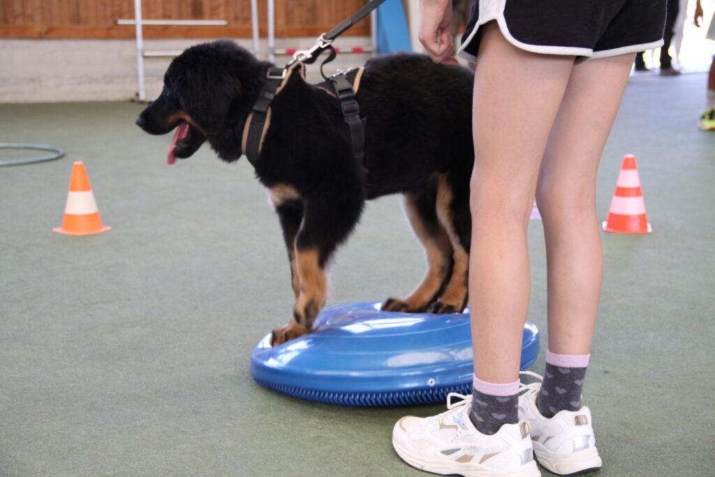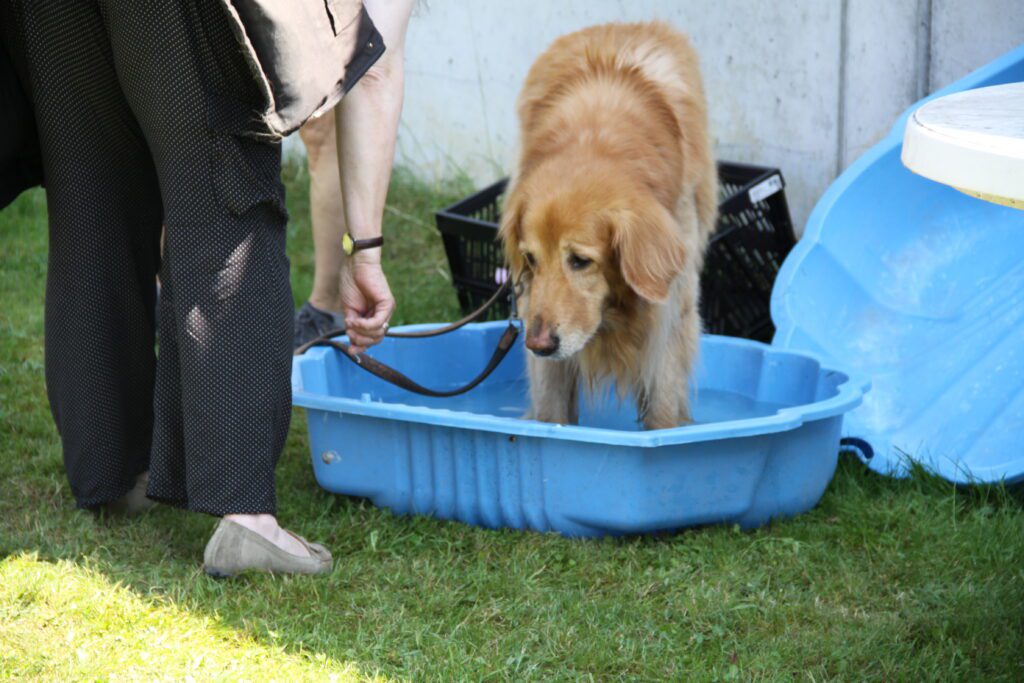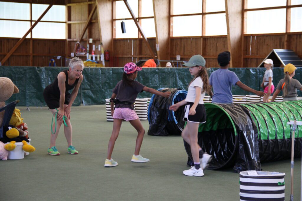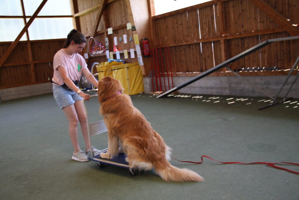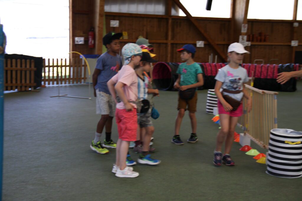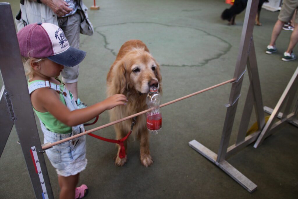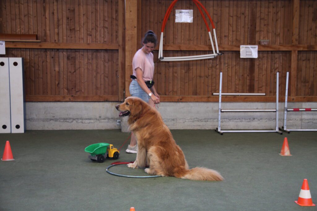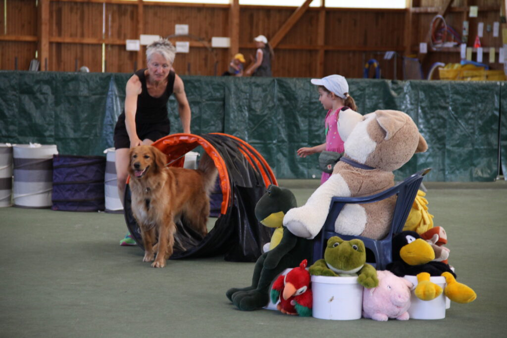 Zahlreiche Posten mit teils kniffligen Aufgaben forderten die Teams heraus: Geschicklichkeit, Phantasie und "Mut" waren gefragt, um die Aufgaben zu meistern. Beim Büchsen-Werfen und beim «Schwertransport», bei welchem der Hund in einem Hulahop-Ring sitzen bleiben musste, währenddem die Kinder mit einem mit Würstchen beladenen Spielzeuglastwagen manövrierten, ging es um die Impulskontrolle. Ihre vorzügliche Nase konnten die Hunde beim Suchen von Keksen, die in einer Muffinform unter Tennisbällen versteckt waren, unter Beweis stellen. Aber auch beim Suchen von in der Wiese verteilten Hölzli war Nasenarbeit gefragt, das Lösungswort aus Buchstabensalat A-O-H-W-R-A-V-T zu bilden, war dann aber Aufgabe der Kinder. Für etwas Abkühlung sorgte das Würstli-Fischen aus dem Wasser und das Abschiessen von Bechern mit einer Wasserpistole. Eine echte Herausforderung war der Schlittenhund-Posten, bei welchem für die Hunde auf einem Plattformwagen sitzend durch einen Slalom gefahren werden mussten. Da die Sitzfläche für die grossen Rüden eher knapp bemessen war, hatte der eine oder andere sichtlich Mühe sich hinzusetzen – die herunterhängenden Rute putzte dann auch gleich noch den Boden.