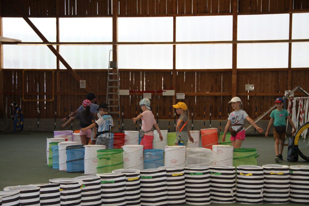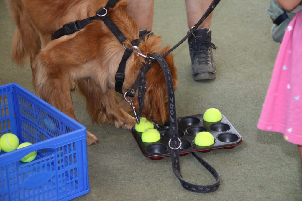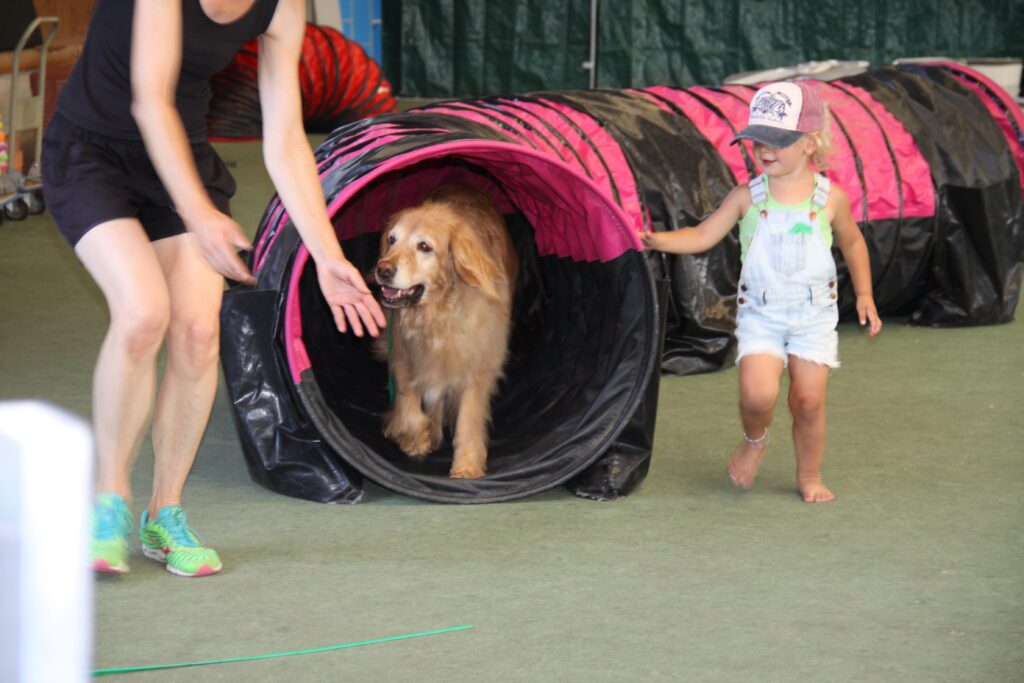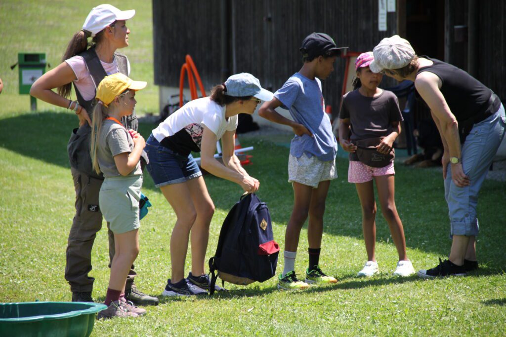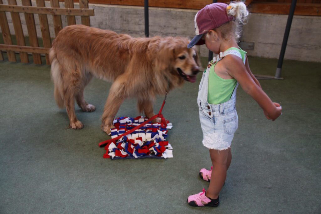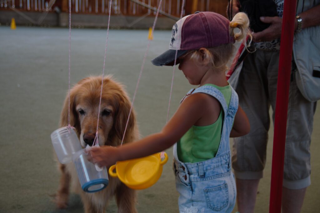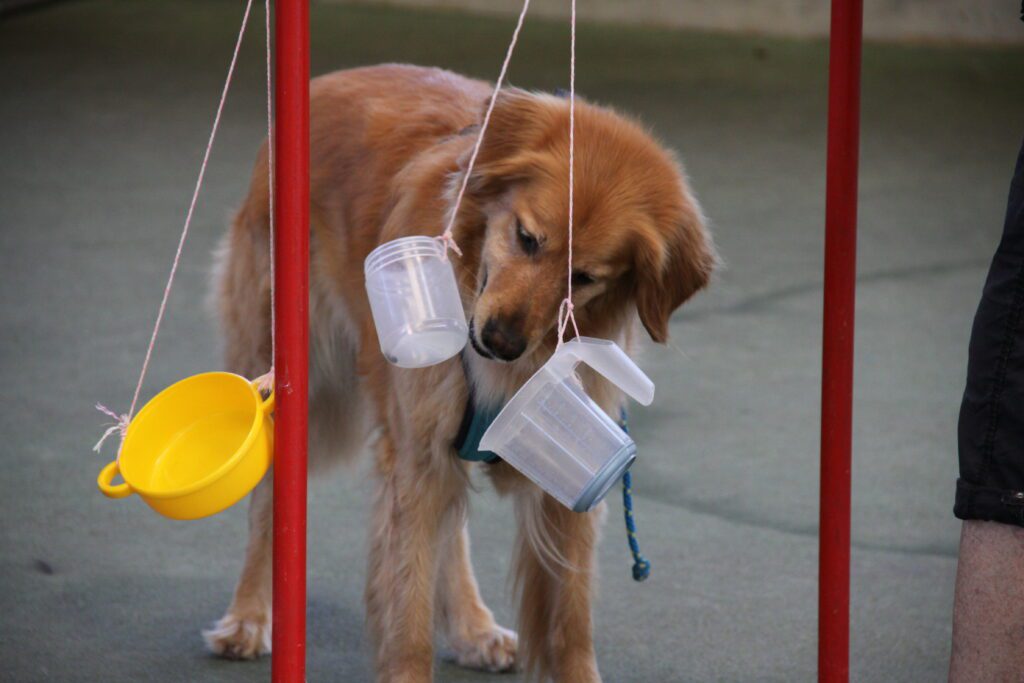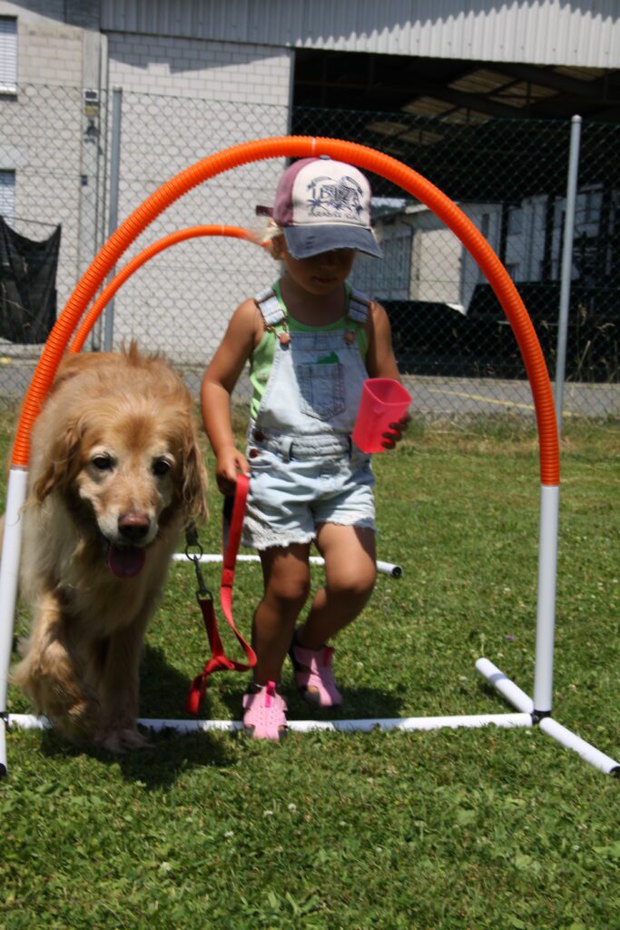 Zahlreiche Posten mit teils kniffligen Aufgaben forderten die Teams heraus: Geschicklichkeit, Phantasie und "Mut" waren gefragt, um die Aufgaben zu meistern. Beim Büchsen-Werfen und beim «Schwertransport», bei welchem der Hund in einem Hulahop-Ring sitzen bleiben musste, währenddem die Kinder mit einem mit Würstchen beladenen Spielzeuglastwagen manövrierten, ging es um die Impulskontrolle. Ihre vorzügliche Nase konnten die Hunde beim Suchen von Keksen, die in einer Muffinform unter Tennisbällen versteckt waren, unter Beweis stellen. Aber auch beim Suchen von in der Wiese verteilten Hölzli war Nasenarbeit gefragt, das Lösungswort aus Buchstabensalat A-O-H-W-R-A-V-T zu bilden, war dann aber Aufgabe der Kinder. Für etwas Abkühlung sorgte das Würstli-Fischen aus dem Wasser und das Abschiessen von Bechern mit einer Wasserpistole. Eine echte Herausforderung war der Schlittenhund-Posten, bei welchem für die Hunde auf einem Plattformwagen sitzend durch einen Slalom gefahren werden mussten. Da die Sitzfläche für die grossen Rüden eher knapp bemessen war, hatte der eine oder andere sichtlich Mühe sich hinzusetzen – die herunterhängenden Rute putzte dann auch gleich noch den Boden.